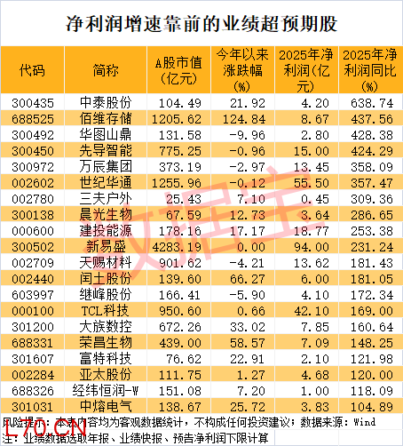 业绩增速方面,据数据宝统计,共有21只股票2025年净利润翻倍增长(含扭亏为盈)。业绩扭亏的股票包括中泰股份、三夫户外、荣昌生物、继峰股份、经纬恒润-W等。