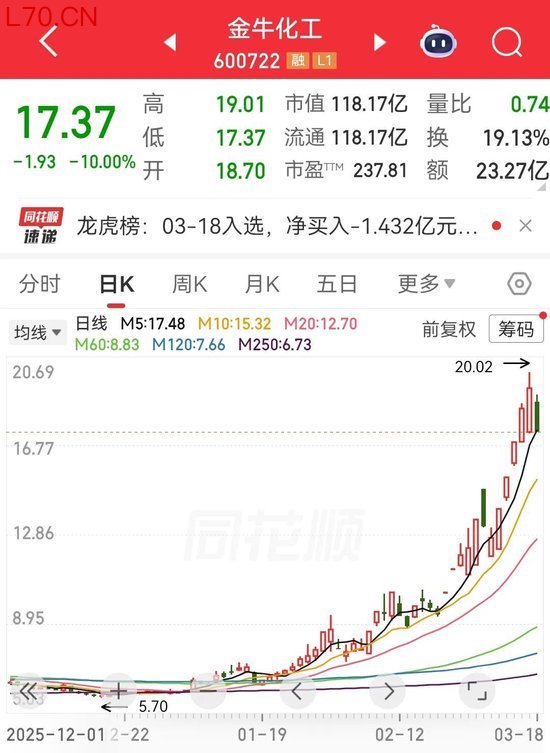 多只化工热门股今日遭遇大幅调整。金牛化工(600722)是近期最热门的化工股之一,该股于3月17日盘中股价突破20元/股,创下历史新高,年内最大涨幅一度达到2.3倍以上。该公司主要从事甲醇的生产和销售,产量为20万吨/年。今日该股大幅低开,收盘股价跌停。