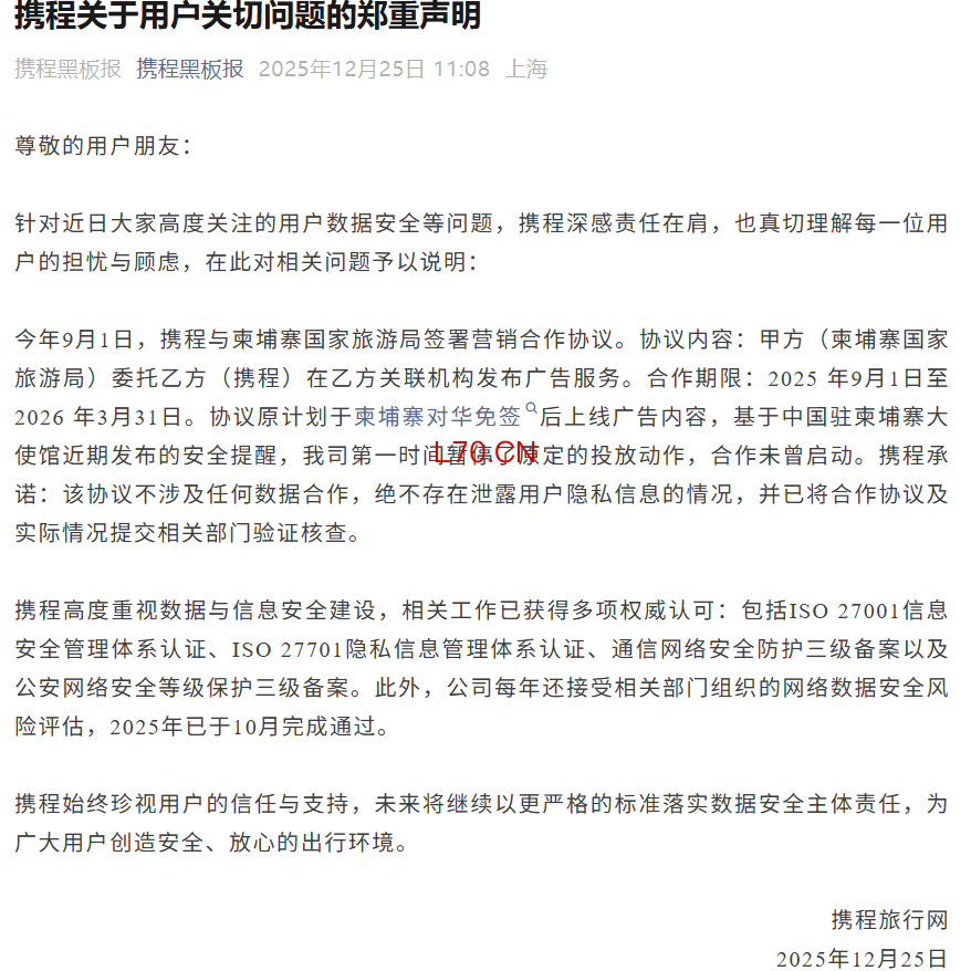 携程声明:与柬埔寨国家旅游局合作未曾启动,不涉及任何数据合作