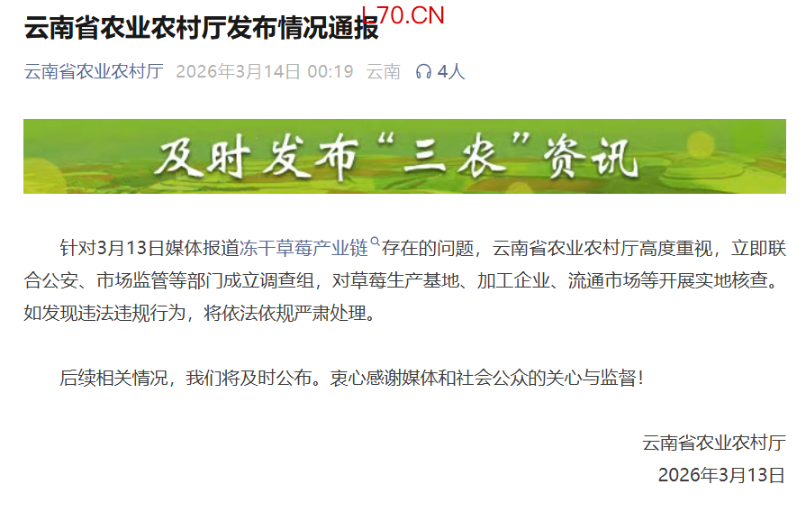 3月14日凌晨,“云南省农业农村厅”微信号发布情况通报,回应媒体报道冻干草莓产业链存在的问题称,成立调查组实地核查。
