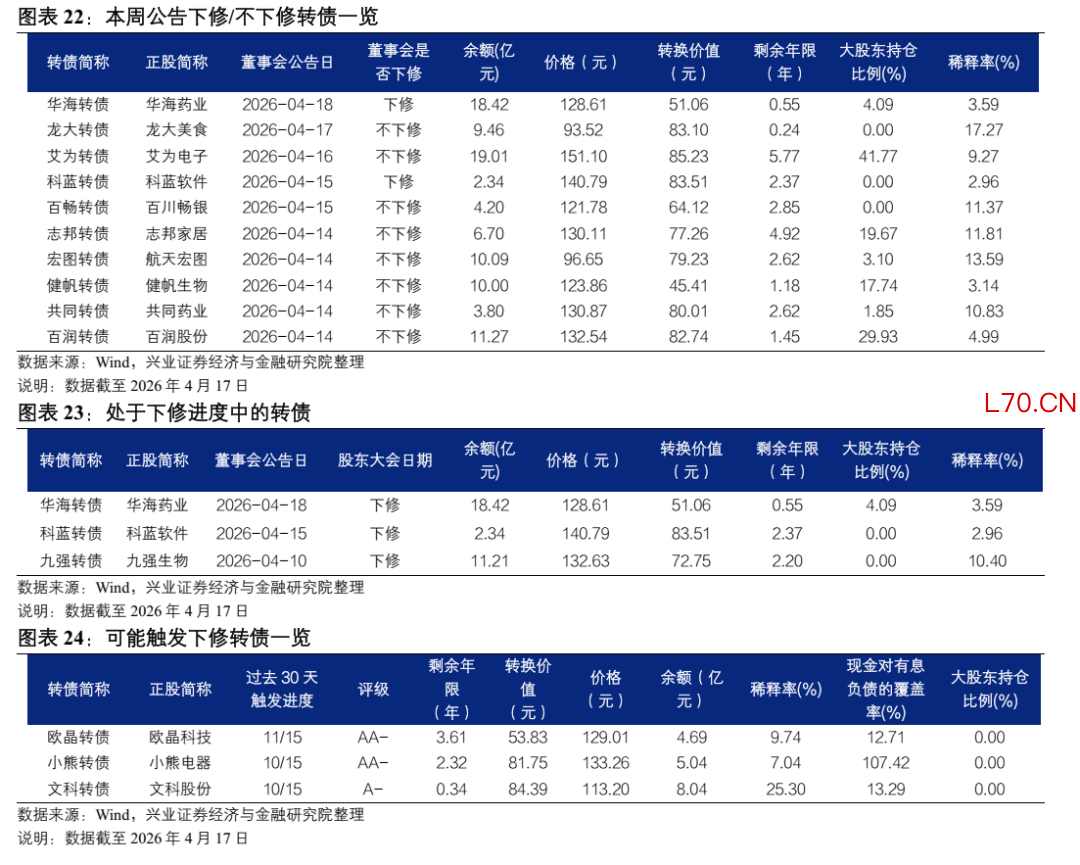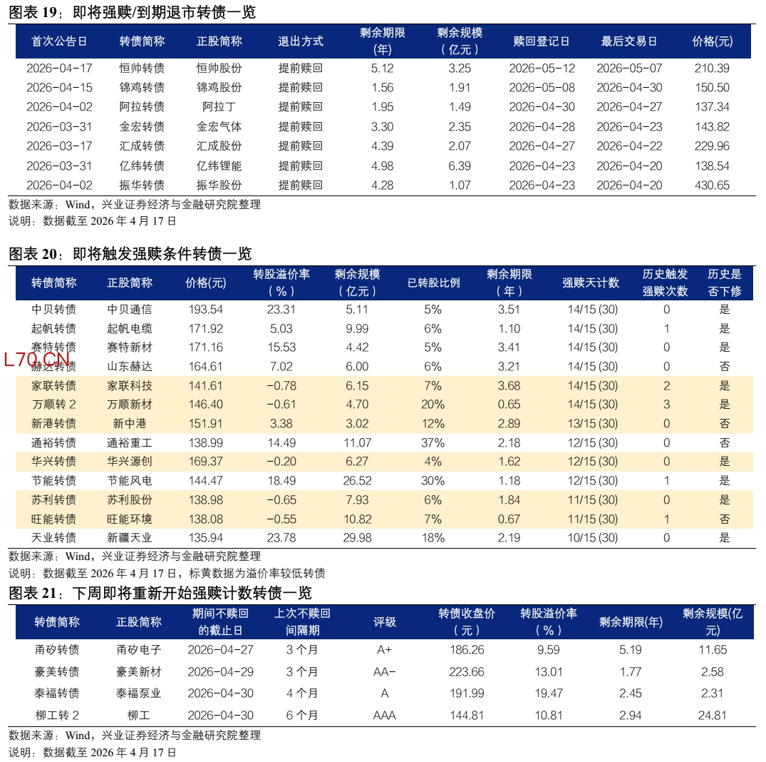 目前已经开始进入强赎计数阶段的转债共41只,其中下周可能触发强赎条件的转债(即还有5个交易日触发强赎)共13只,需要重点关注。从定价表现来看,截至2026年4月17日,家联转债、万顺转2、新港转债、华兴转债、苏利转债和旺能转债当前溢价水平较低,市场存在一定赎回预期;中贝转债和苏利转债过去5个交易日估值分别压缩5.03/5.55pct,但目前中贝转债估值还有23.31%,而赛特转债和天业转债过去5个交易日估值分别抬升8.9/6.05pct。近期市场波动加大,叠加估值高位,市场对于强赎风险的博弈时间点预计进一步提前。