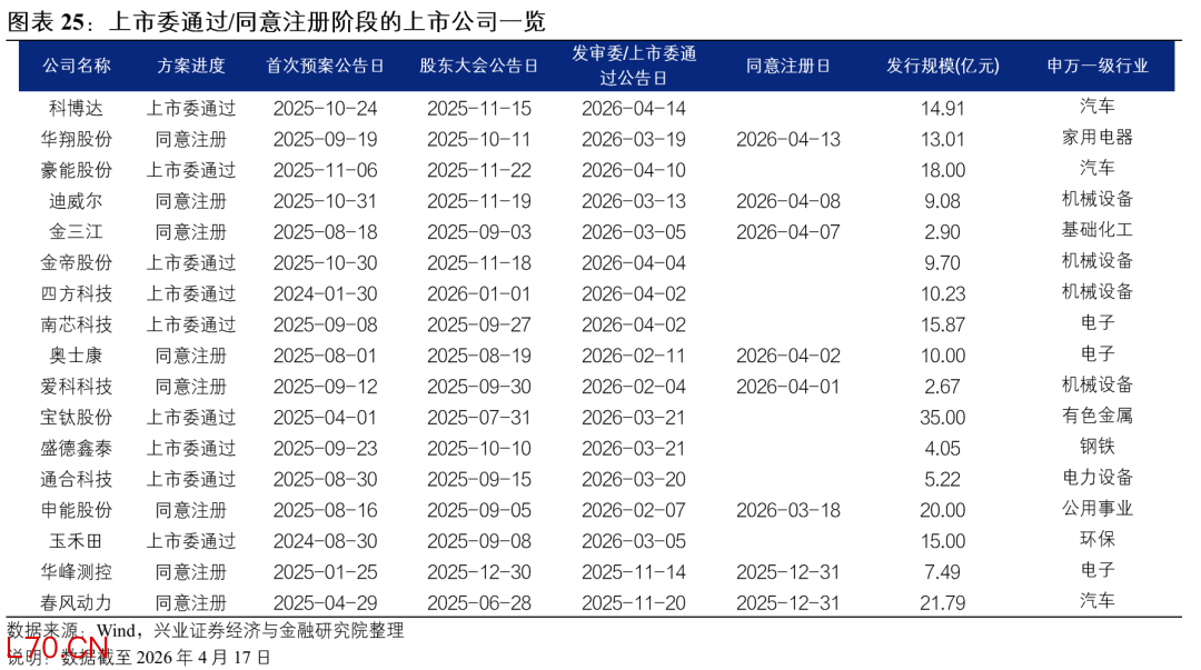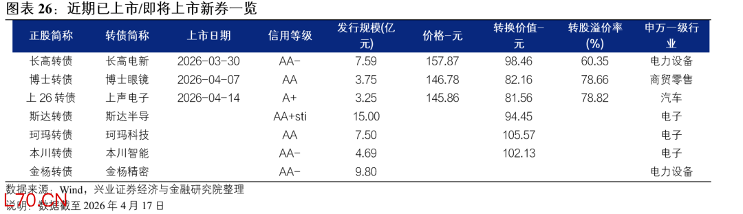 截至本周五(2026年4月17日),还有4只已发行未上市的转债:斯达转债(评级AA+,发行规模15.0亿元)、珂玛转债(评级AA,发行规模7.5亿元)、本川转债(评级AA-,发行规模4.69亿元)、金杨转债(评级AA-,发行规模9.8亿元),关注近期斯达转债和珂玛转债的上市机会。