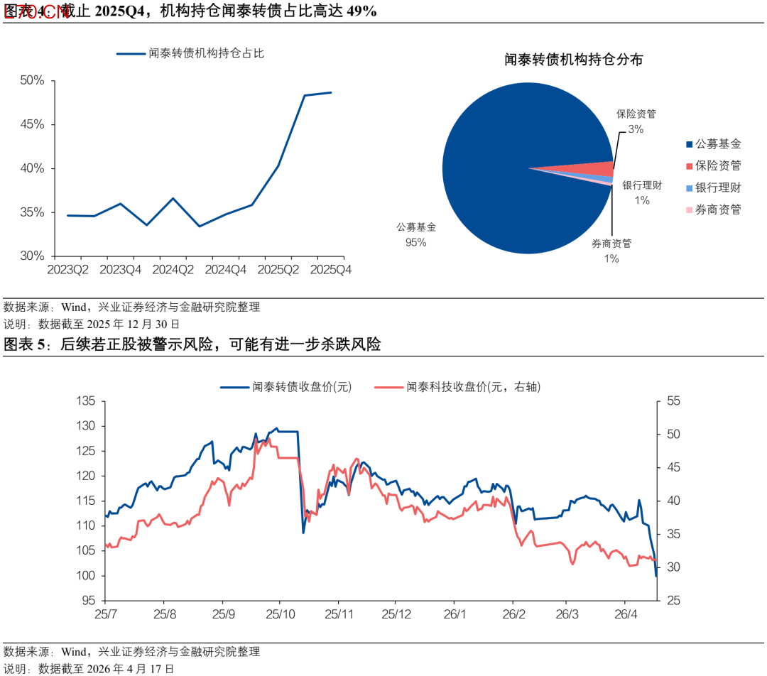 若正股出现风险警示压力,转债可能面临进一步的机构出库风险。截至2025年Q4,闻泰转债的机构持仓高达48.66%,处于2023年以来最高水平,出库的冲击较高;转债当前剩余规模有86亿元,考虑到当前信用评级较低,能够承接的资金也相对有限。市场对于业绩披露后的潜在抛盘压力的担忧,是最近转债价格提前反应的重要因素。