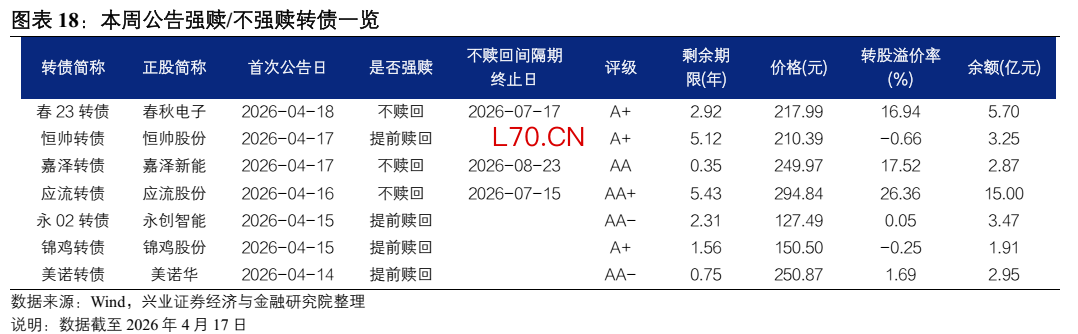本周满足强赎条件的转债数量明显回升。本周(2026年4月13日-4月19日)共有7只转债触发强赎:恒帅转债、永02转债、锦鸡转债与美诺转债公告提前赎回,其余3只转债不强赎,其中嘉泽转债在到期之前都不行使提前赎回权利。