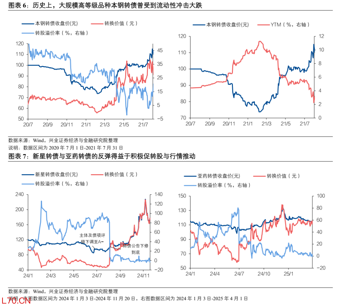 3) 短剩余期限叠加弱资质,亚药转债通过积极促转股“自救”。由于连续亏损、经营性现金流为负、重大诉讼等因素,亚药转债及正股历史上评级出现多次下调,属于绝对的低资质转债。2024年6月,亚药转债也一度跌破面值,最低价格98元,此时转债距离到期仅有不到一年。但亚药转债在后续8月负反馈调整中下跌并不明显,一方面在于转债此前积极下修,另一方面CCC的评级下基本不存在机构投资者,出库压力不大。随后发行人在牛市行情下积极促转股,成功在到期之前实现强赎。