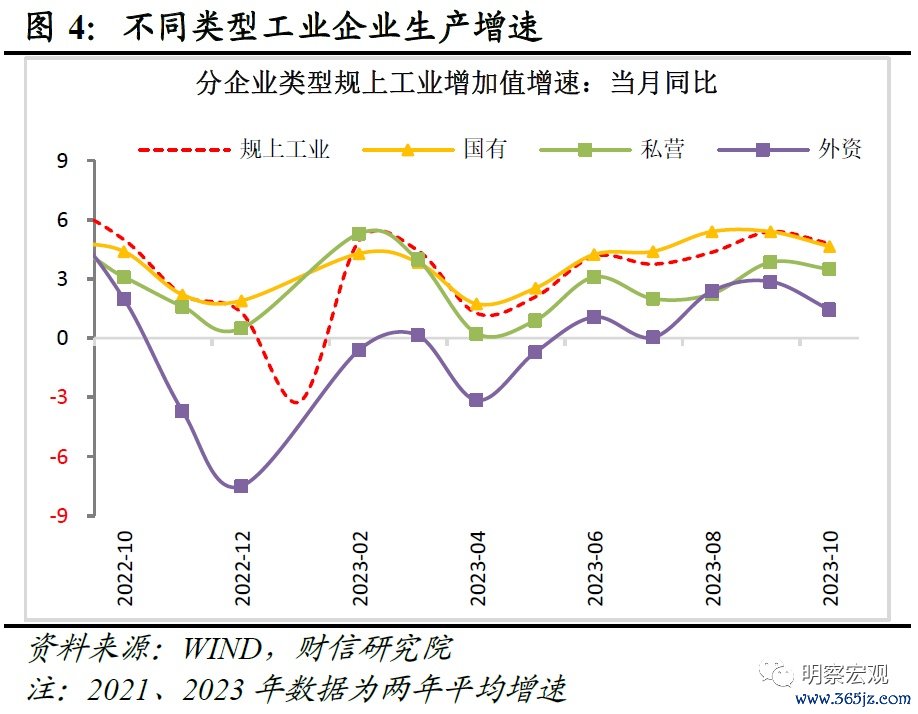 10月工业生产恢复偏弱,原因有三:一是下游投资、消费、出口三大终端需求边际均有所走弱,对生产活动形成一定制约,如10月份三大需求两年平均增速均较上月有所回落,国内需求不足问题依旧突出,规上工业产销率连续三个月保持不变,且仍处于历史同期偏低水平,也反映出当前产销衔接水平仍待提升(见图3);二是10月PPI、CPI增速均超预期回落,导致“弱价格-弱预期-弱现实”的负反馈循环有所增强,企业增加生产的意愿仍不足;三是分企业类型看,受外需放缓、产业链供应链部分向外转移等因素拖累,外企生产增速一直弱于全部规上工业企业且本月放缓最多,拖累较为显著(见图4)。往后看,超低的基数效应,加上政策加力支持需求恢复,有望支撑未来两个月工业增加值增速继续回升,但一揽子地产刺激政策效果不及预期、居民“就业-收入-消费”循环修复偏慢,需求改善力度或偏弱,剔除基数效应后的工业增加值两年平均增速修复高度或不宜高估。