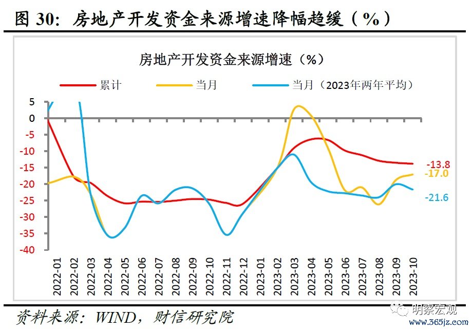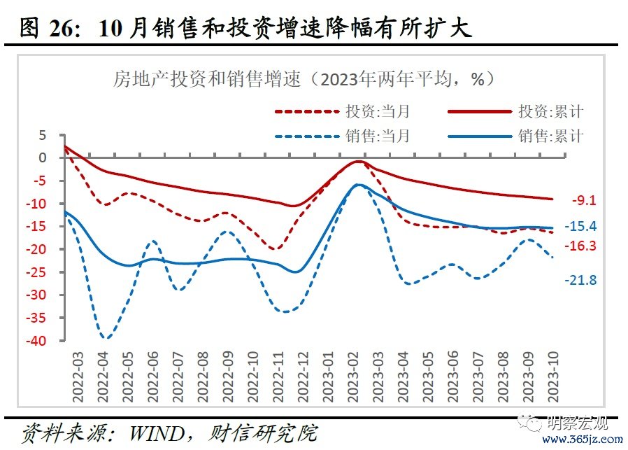 从需求看,商品房销售面积和开发投资增速降幅继续扩大。一是销售面积降幅继续扩大。1-10月商品房销售面积增速同比降低7.8%,降幅较1-9月扩大0.3个百分点,连续6个月降幅扩大;扣除去年同期基数影响后的两年平均增速为-15.4%,降幅较上月扩大0.2个百分点。从当月增速看,10月同比下降20.3%,两年平均增长-21.8%,降幅均较上月有所扩大(见图26)。二是投资增速降幅没能延续上月的收窄态势。今年1-10月全国房地产开发投资同比下降9.3%,两年平均增长-9.1%,降幅分别较上月扩大0.2和0.5个百分点;从当月增速看,10月下降16.7%,两年平均增长-16.3%,降幅有所扩大(见图26-27)。
