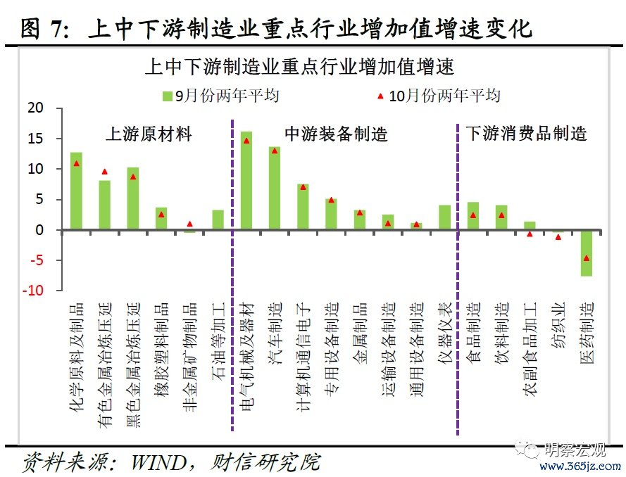 从制造业内部看,上中下游增加值两年平均增速均有所放缓。考虑到去年同期基数变化较大,对观测制造业各细分行业的生产恢复情况形成一定扰动,因此我们重点分析剔除基数效应后两年平均增速的变化(见图6-7)。结果显示:一是受近期原油等大宗商品价格回落、终端投资需求有所走弱的影响,10月原材料制造业行业增加值两年平均增速多数放缓(见图7),如化学原料及制品、黑色金属冶炼压延、橡胶塑料制品业增加值两年平均增速均较上月回落1个百分点以上。二是受出口降幅扩大、国内需求偏弱等因素影响,中游装备制造业增加值两年平均增速均较上月小幅有所回落(见图7),但电气机械及器材、汽车制造两年平均增速仍保持双位数增长,支撑作用仍强(见图7),统计局也表示10月份规模以上装备制造业增加值对全部规上工业增加值贡献率达到45.1%,贡献仍突出。三是尽管国内消费需求继续恢复,但其恢复力度偏弱制约了下游消费品制造业企业的生产意愿,10月已公布数值的下游消费品制造业增加值两年平均增速,除医药制造业外,均有所回落(见图7)。