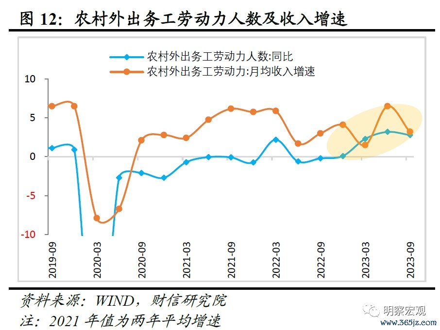 这与国内基建投资维持较快增长、服务业持续恢复,推动外来农业户籍人口调查失业率自2月的6%降至10月份的4.6%,前三季度农村外出务工劳动力人数增速、月均收入增速总体改善相关(见图12-13)。但当前国内民企投资信心恢复偏慢,仍会拖累“就业-收入-消费”循环修复进度,中低收入群体消费恢复或仍面临波折且是一个偏慢的过程。
