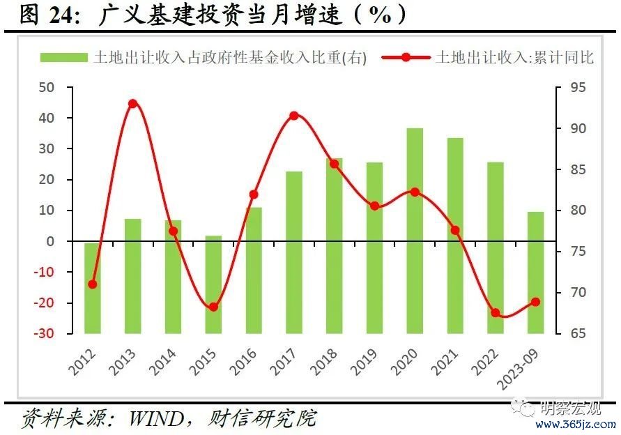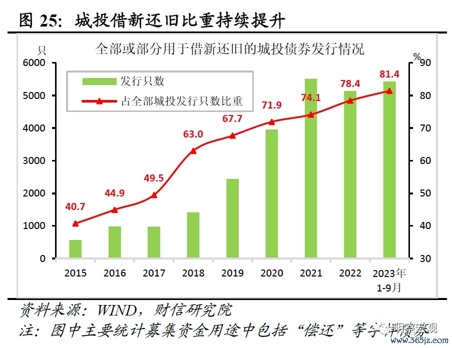 三是土地市场低迷和地方化债推进均对基建投资增速形成一定的制约。其一,占政府性基金收入超九成的土地出让收入持续负增(见图24),一方面会直接降低财政对基建投资的支持力度,另一方面会削弱城投平台融资能力,对基建投资资金来源形成间接拖累。其二,随着一揽子化债方案出台,在剥离政府融资职能的大趋势下,城投新增融资用于政府投资的规模将明显受限,对基建投资资金来源的贡献相对较小。如根据募集资金用途统计,2023年1-9月份全部或部分用于偿还债务的城投债券发行只数比重上升至81.4%(见图25),这意味着城投平台新发行债券用于项目建设的比重不断下降,对基建的支撑力度或持续偏弱。