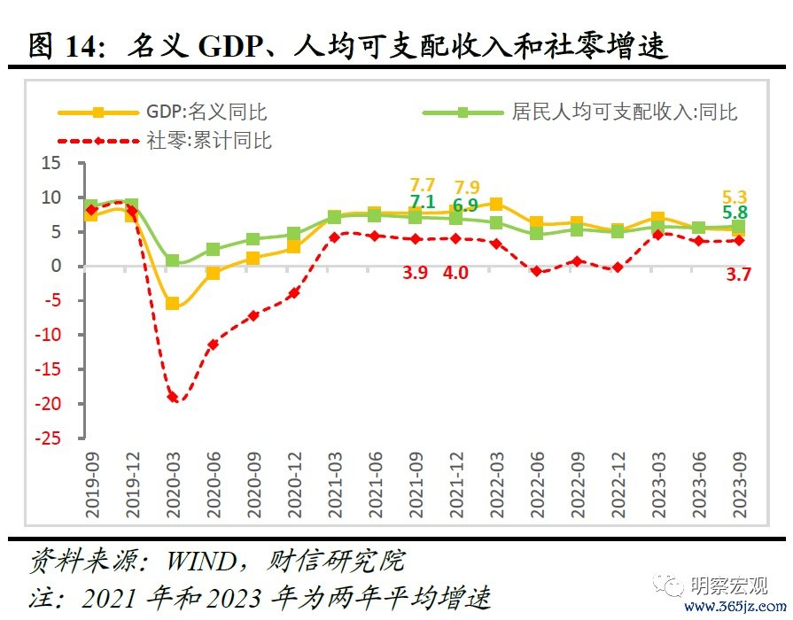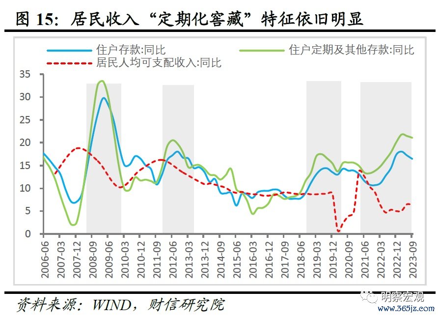 三是消费修复高度仍不宜过度高估,乐观估计全年社零约增长7-8%。一方面,以2021年为参考系,当前国内居民可支配收入增速、边际消费倾向或均弱于2021年水平,意味着消费恢复情况或难以超过彼时的高度,乐观估计2023年社零约增长7-8%、两年平均约增长4%(2021年两年平均增长4%)。如从居民可支配收入看,2023年名义GDP两年平均增速和居民人均可支配两年平均增速中枢或在5-6%左右,较2021年约7-8%的中枢水平明显下台阶(见图14);从边际消费倾向看,当前居民对未来经济和收入预期偏谨慎,增加预防性储蓄意愿仍强,如居民将更多收入“定期化窖藏”行为依旧明显、超过2021年水平,或导致居民边际消费倾向的改善仍偏慢(见图15)。另一方面,近年来民营企业已成为我国新增就业的主要提供者,但2017-2022年其接连遭受金融去杠杆、中美贸易冲突、新冠肺炎疫情、俄乌冲突等多轮内外部冲击,导致其经营陷入困境、增加投资意愿不足,或持续拖累居民“就业-收入-消费”循环恢复偏慢,制约居民消费潜能的释放。
