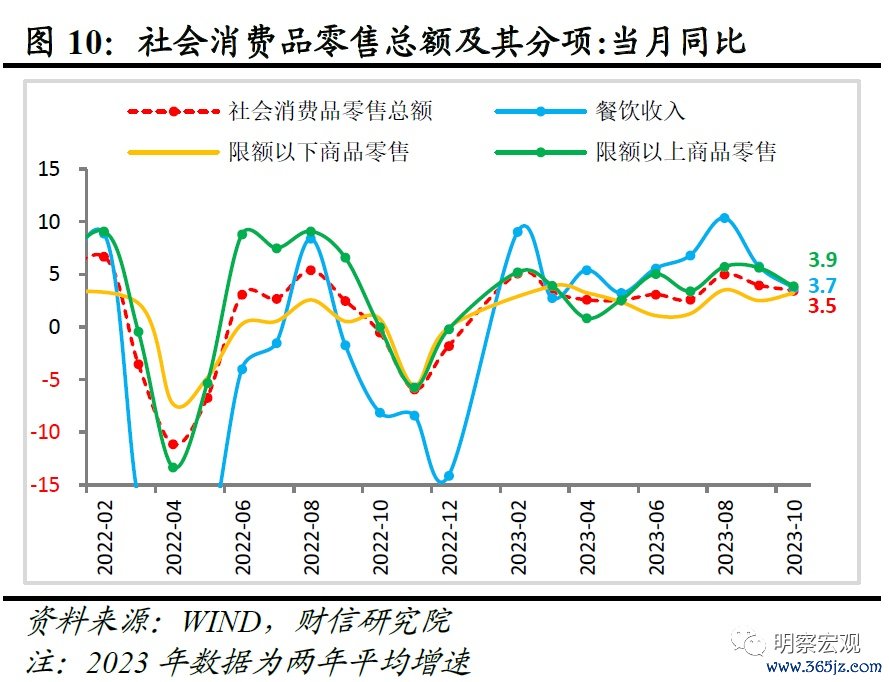 一是餐饮收入两年平均增速高位继续回落,是社零改善有限的主因之一。如受国内居民消费意愿偏弱,暑期假期透支部分出行需求,加上服务价格连续两个月环比为负等因素影响,10月餐饮收入两年平均增长3.7%,较上月回落2.1个百分点(见图10),拖累社零两年平均增速较上月放缓约0.2个百分点。