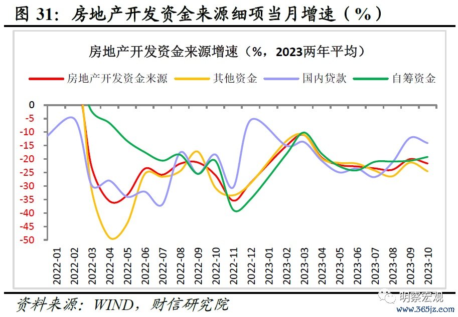 一是房企资金来源增速降幅再次扩大。2023年1-10月房地产资金来源同比下降13.8%,降幅较上月扩大0.3个百分点;当月增长-17.0%,降幅较上月收窄1.8个百分点(见图30);扣除基数的影响后,资金来源累计和当月的两年平均增速分别增长-19.4%、-21.6%,降幅较上月分别扩大0.2、1.6个百分点。从资金来源细项数据看,其他资金(由个人按揭贷款、定金及预收款两部分组成)在资金来源中的比重达到55.3%,10月当月增速为-18.0%,较上月大幅收窄7.2个百分点,但两年平均当月增速降幅较上月扩大3.2个百分点;国内贷款受8月份房地产政策影响,9月出现较大幅改善,但10月份降幅再次扩大(见图31)。