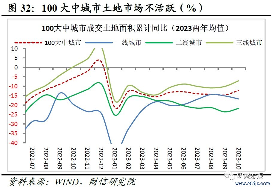 二是土地市场不活跃,民营房企拿地意愿较弱。受房价下降和房地产销售放缓影响,土地市场疲弱,没有明显恢复,土地成交面积增速仍为负增长,且降幅整体扩大。如1-10月100个大中城市、一线、二线、三线城市成交土地面积两年平均增速分别为-12.2%、-16.8%、-21.7%、-7.1%,较上月分别变动2.4、-1.6、1.9、3.0个百分点,降幅收缩收窄,但仍处于深度调整中(见图32)。由于房地产市场中民营房企占比约80%,土地市场的疲弱,也表明民企拿地意愿不足,拿地主力军估计是各地地方国资和央企。土地市场的真正自发好转,尚需销售市场的持续向好。