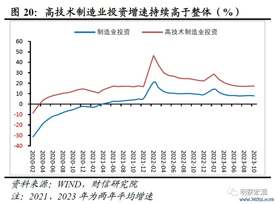 高技术制造业持续领跑,制造业投资结构继续优化。1-10月高技术制造业投资累计增长11.3%,两年平均增长17.3%,高于制造业投资两年平均增速9.4个百分点(见图20),较前值扩大0.3个百分点,新动能投资增速持续领跑整体,我国制造业投资结构进一步优化。