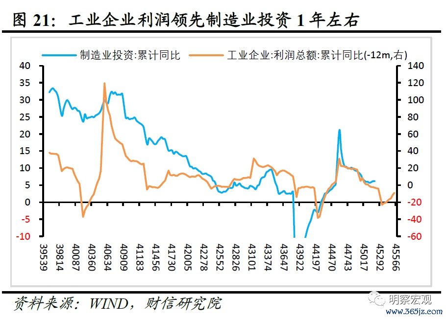 展望年内,预计制造业投资将继续运行在韧性区间,全年约增长6%。一是受益于政策和金融支持,未来高技术和设备更新改造投资高增仍具有一定的持续性;二是年末PPI回升存在波折、企业仍处于去库存尾声,制造业企业投资扩产意愿或转向谨慎;三是地产出口需求低迷以及高基数均对制造业投资增速回升形成钳制;四是盈利走弱对制造业投资的滞后拖累作用尚未完全显现,如2022年四季度以来工业企业利润增速持续回落,不利于四季度制造业投资增速的企稳回升(见图21)。