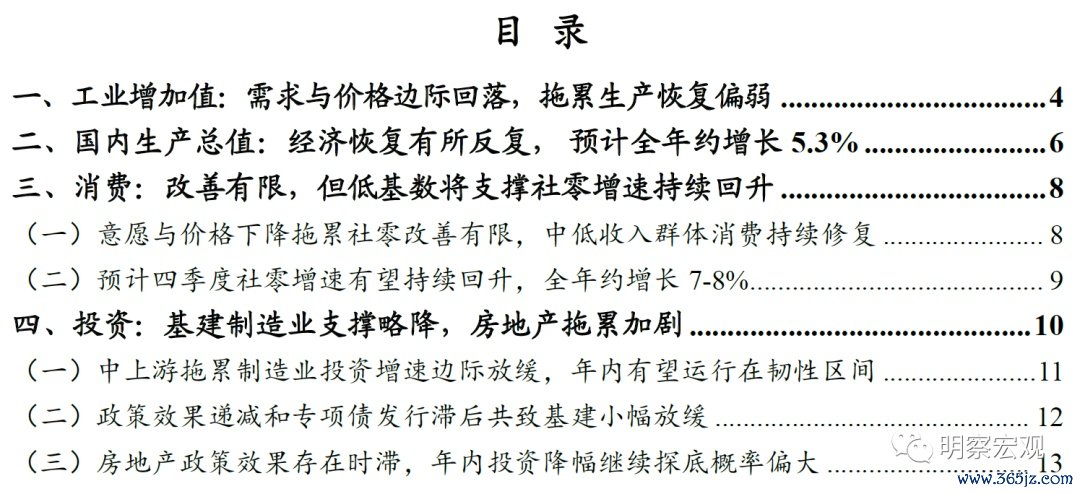>> 国内生产总值(GDP):经济恢复有所反复, 预计全年约增长5.3%。一是低基数效应、中低收入群体就业收入总体改善、服务消费维持高景气、刺激政策发力显效,有望共同支撑四季度社零增速加快回升,但民间投资恢复偏弱,消费修复高度不宜过度高估。二是投资增速有望保持平稳。其中,房地产投资降幅大概率与去年相当;基建投资短期有望维持高增,全年约增长8%;制造业投资有望继续运行在韧性区间内。三是低基数效应大概率带动年末出口增速转正,加上价格拖累减弱,预计全年出口约增长-4.5%左右。