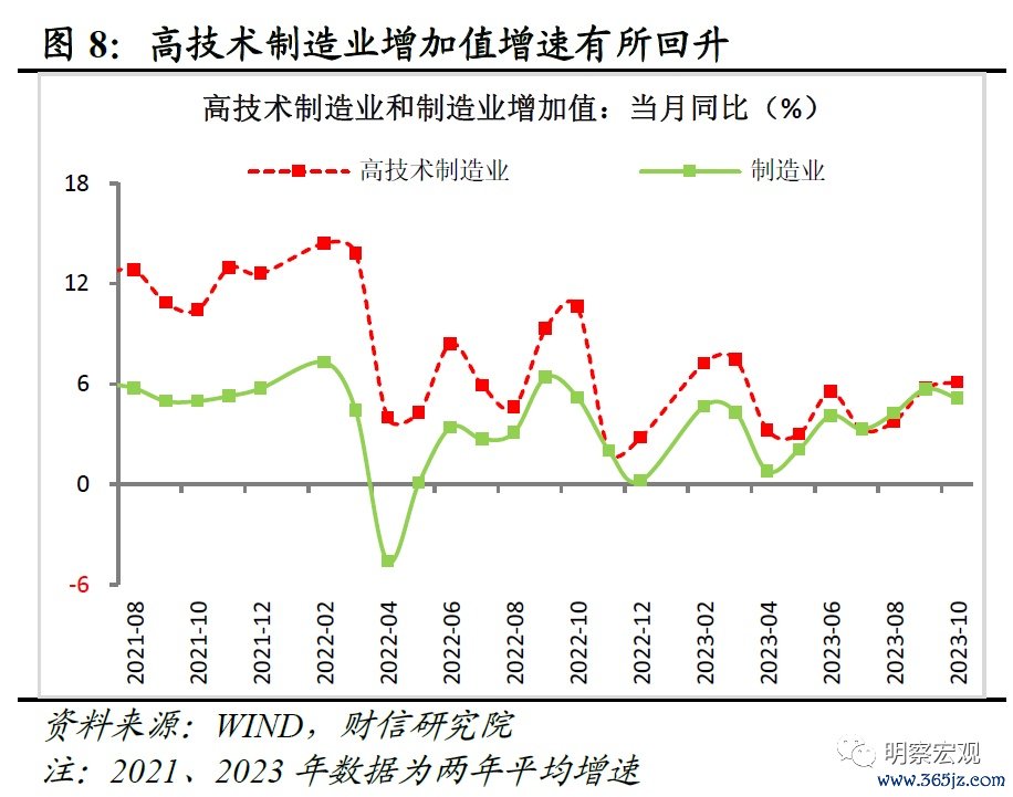 从产业结构看,高技术制造业生产两年平均增速回升,产业升级步伐加快。10月份规模以上高技术制造业增加值两年平均增长6.1%,增速较上月提高0.4个百分点,高于同期全部制造业1.0个百分点(见图8),反映出产业升级步伐继续加快。但受高基数效应的拖累,今年高技术制造业增加值同比增速的读数偏低,需要辩证看待,如2020-2022年高技术制造业增加值三年平均增长10.8%,增速为同期全部制造业两倍,不利于今年其增速提高。此外,从产品产量看,10月份太阳能(000591)电池、服务机器人、集成电路等绿色智能新产品产量同比分别增长62.8%、59.1%、34.5%,也表明新动能在持续壮大。