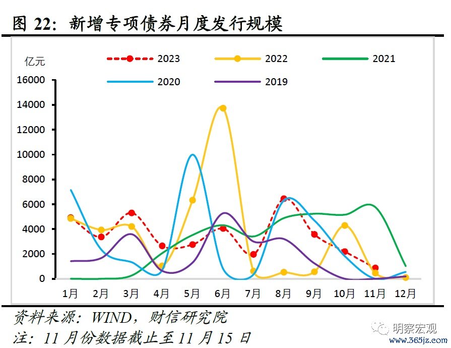 一是增发国债加快发行、专项债券使用提速,均对短期基建投资资金来源形成支撑,但作用不宜高估。其一,据统计,截止11月15日,3.8万亿元的新增专项债券已基本发行完毕(见图22),但发行节奏慢于财政部“力争在9月底前基本发行完毕”的要求,因此预计仍有部分专项债券资金于年底使用,对基建投资资金来源形成支撑;其二,增发国债对年内基建投资资金形成支撑。根据国务院安排,1万亿元增发国债资金有5000亿元于今年使用,并且主要用于水利工程投资,将对前期持续低迷的水利工程投资形成较强支撑。但考虑到当前已进入到11月中旬,增发国债尚未发行,加上从国债发行到使用存在时滞,因此预计年内基建投资增长空间有限。