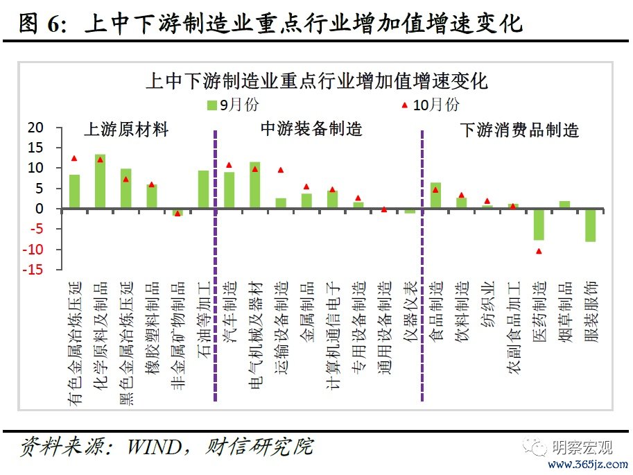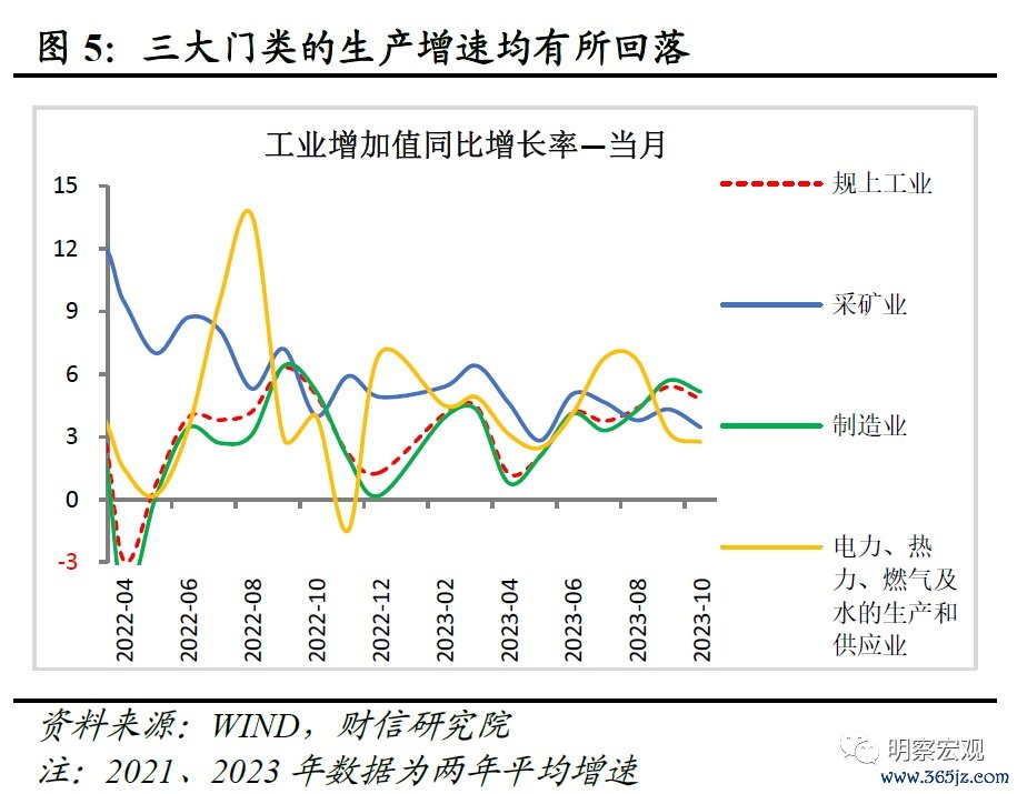 从三大门类看,采矿业、制造业等均有拖累。10月份采矿业、制造业、电力热力燃气及水的生产和供应业增加值两年平均增速分别为3.4%、5.1%和2.7%,分别较9月份回落0.9、0.6和0.5个百分点,三者均有所放缓,前两者的拖累相对更大(规上制造业营收占全部规上工业营收的比重达85%以上)(见图5)。其中,采矿业生产放缓或源于近期大宗商品价格回落、投资端终端需求走弱;电力热力燃气及水的生产和供应业生产回落,则主要与用电需求下降、去年同期基数有所抬升相关。