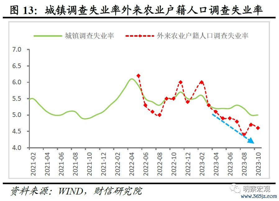 二是中低收入群体就业收入总体改善,有利于限额以下商品零售继续修复。受益于年内批发零售业、住宿餐饮业、交通运输业、建筑业等吸纳农民工就业较多的行业恢复较快(上述四大行业约吸纳了超四成的农民工就业),2023年前三季度农村外出务工劳动力人数持续保持正增长,同期外来农业户籍人口调查失业率较去年末下降较多且低于大幅全国城镇调查失业率(见图12-13)。这意味着中低收入群体就业收入总体仍处于修复通道,限额以下商品零售增速总体回升可期且其修复空间巨大。