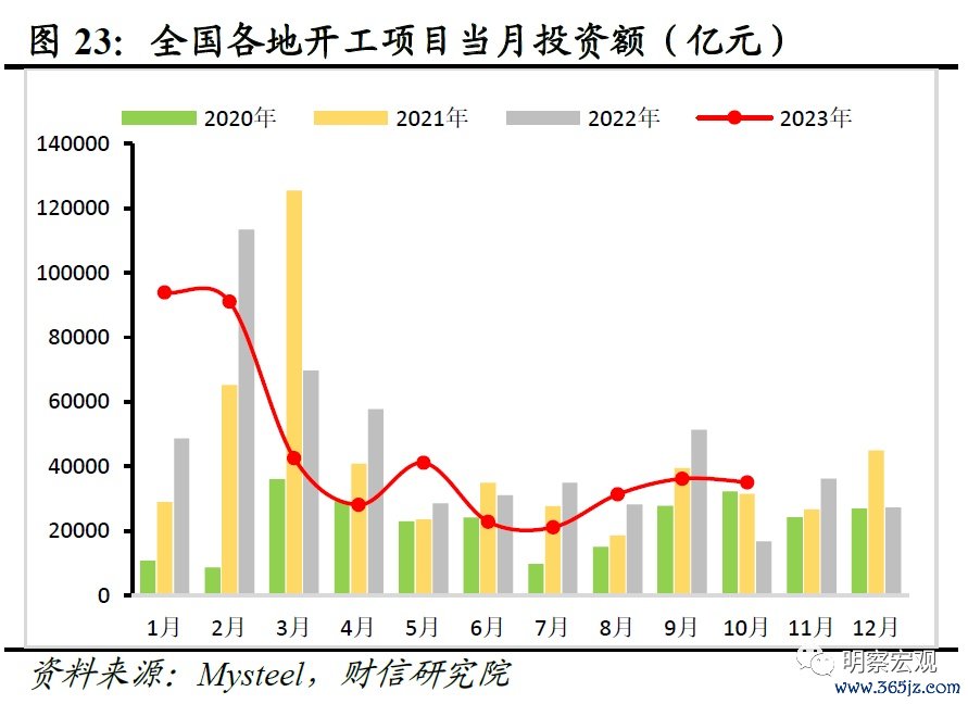 二是前期在建项目和为稳增长下项目再提速,短时间内基建项目端仍有一定保障。一方面,疫情三年各地积极推进重大项目开工,加上今年上半年基建项目开工也有所提速,累积的在建项目将为未来基建投资提供一定的项目保障。另一方面,随着稳增长压力显现,7月份以来各地重大项目开工年内迎来再提速,如根据Mysteel统计,7-9月份全国各地重大项目开工投资额规模环比逐月提升,10月份虽然略有下降,但高于2021-2022年同期较多(见图23)。