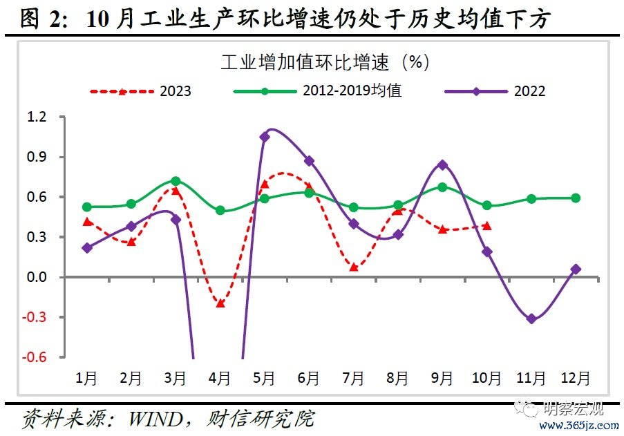2023年1-10月份全国规模以上工业增加值同比增长4.1%,比1-9月份加快0.1个百分点。其中,10月当月规上工业增加值同比增长4.6%,较上月提高0.1个百分点;但扣除基数效应后的两年平均增速,较上月回落0.6百分点至4.8%(见图1),反映出工业生产恢复有所放缓。从环比增速看,10月工业增加值环比增长0.39%,仍处于历史同期均值水平下方(见图2),也表明工业生产恢复总体偏弱。