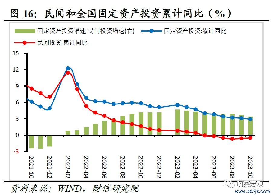 从民间和固定资产投资增速差看,1-10月份民间投资累计增速低于固定资产投资增速3.4个百分点,较上月回落0.3个百分点(见图18),两者差距收窄也主因基数效应。从两年平均增速差看,1-10月份固定资产投资和民间投资增速差录得3.8%,和上月持平,为年内最高点,且民间投资连续22个月低于全部投资,前者恢复大幅滞后于后者,主要原因在于受房地产市场低迷、政策效果存在反复、物价再度走弱以及海外风险挑战增多等因素影响,民营企业投资的意愿和能力均不足,民间资本“不敢投”“不愿投”的现象依然较为突出,仍待政策加力提振信心、改善预期。