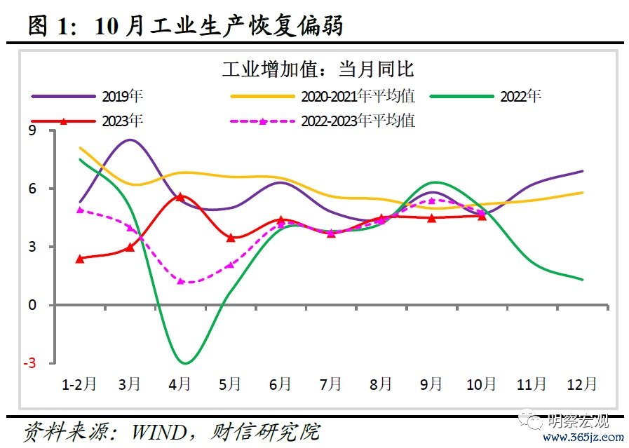 >> 工业增加值:需求与价格边际回落,拖累生产恢复偏弱。10月规上工业增加值两年平均增长4.8%,较上月回落0.6个百分点,工业生产恢复仍偏弱。原因有三:一是下游投资、消费、出口三大终端需求两年平均增速边际均放缓,对生产活动形成制约;二是10月PPI、CPI增速均超预期回落,导致企业增加生产的意愿不足;三是外企生产增速一直弱于全部规上工业企业且本月放缓最多,拖累较为显著。往后看,低基数效应叠加政策加力支持需求恢复,有望支撑工业增加值增速继续回升,但地产刺激政策效果不及预期、居民“就业-收入-消费”循环修复偏慢,剔除基数效应后的两年平均增速修复高度不宜高估。