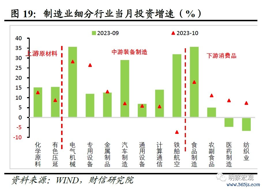 从行业看,中上游是制造业投资放缓的主要原因,下游投资边际回暖。一是受地产基建需求放缓、价格回落压低利润空间等因素影响,上游原材料行业投资扩产意愿有所减弱,如有色金属冶炼和压延加工业、化学原料行业投资增速均边际回落;二是受出口需求超预期回落,前期基数偏高等因素影响,中游装备制造业投资增速多数回落,但受国内转型需求释放和政策支持,电器机械投资增速维持高增,专用设备制造业投资增速回升较多;三是受居民消费恢复向好和国内购物节需求提前释放等因素影响,纺织业、医药制造业等下游行业投资增速有所回升(见图19)。