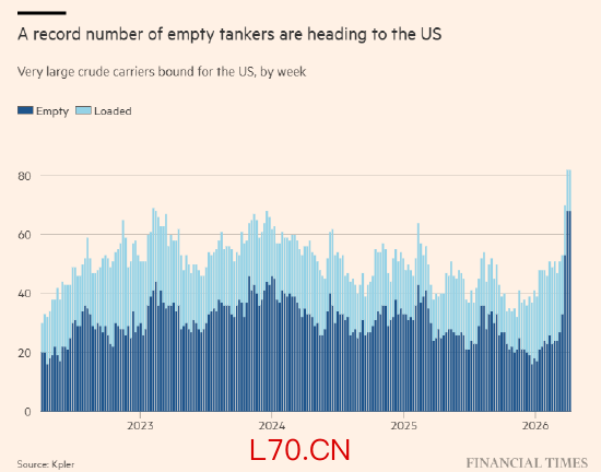 据Kpler统计,目前已有68艘空载油轮正驶向美国,而2月28日战争爆发前一周仅为24艘,去年的平均水平更是只有27艘。Kpler的数据基于油轮预订情况和预计到港量。Kpler分析师马特·史密斯(Matt Smith)表示:“一支庞大的油轮舰队正朝美国驶来。”