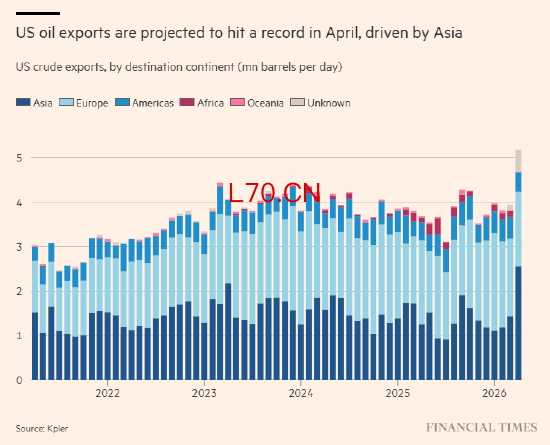 受伊朗战事影响,亚洲客户正疯狂抢购石油以替代从中东断供的原油,美国4月原油出口量预计将创下历史新高。
