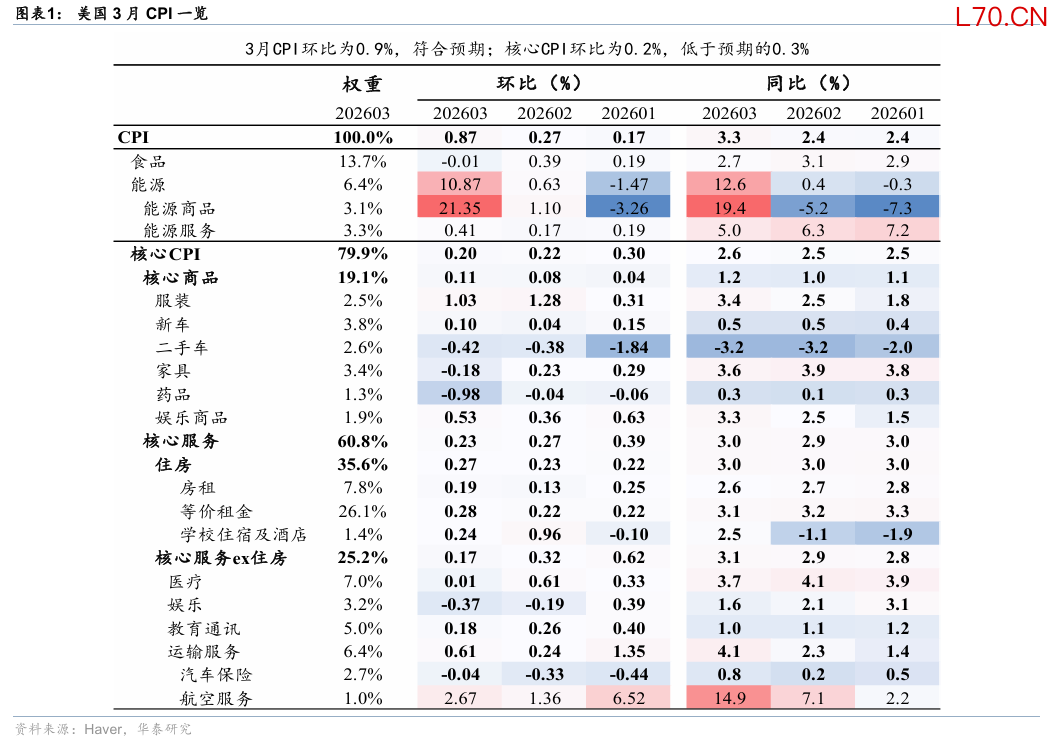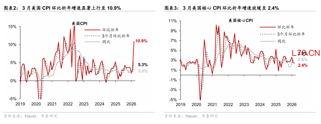 3月CPI环比增速符合预期,高油价推升能源分项带动表观通胀上行,但核心通胀略低于预期,较为温和。3月CPI环比上行0.6pp至0.9%,符合预期(彭博一致预期,下同),同比上行0.9pp至3.3%,略低于预期的3.4%,核心CPI环比持平于0.2%,核心CPI同比小幅上行0.1pp至2.6%,均低于预期。数据公布后,市场反应较为温和。截至北京时间21点30分,相较数据公布前,联储2026年降息预期基本持平于6bp,2y美债收益率基本持平于3.78%,10y美债收益率小幅上行1bp至4.30%,美元指数下跌0.1%至98.6,标普500期货微涨0.1%。