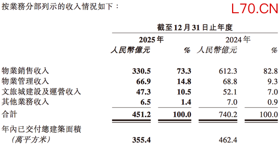 元股证券:ygzq.hk2025年,融创总营收451.2亿元,同比下降39%,较2020年巅峰时期的2305.9亿元已缩水超80%。收入结构中,物业销售收入330.5亿元,占总收入73.3%,同比大幅下滑46%,是营收下滑的核心拖累项。物业销售收入下滑主因交付面积与销售均价双降:全年物业交付面积同比减少23.1%,结转项目销售均价同比下降29.8%。