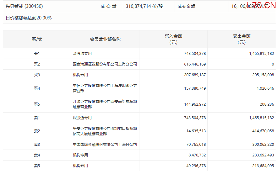 先导智能今日20cm涨停,有2家机构专用席位净卖出4.40亿元
