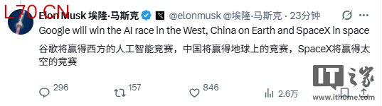 在另外一条帖子中,马斯克称,“谷歌将赢得西方的人工智能竞赛配资网址入口,中国将赢得地球上的竞赛,SpaceX 将赢得太空的竞赛。”