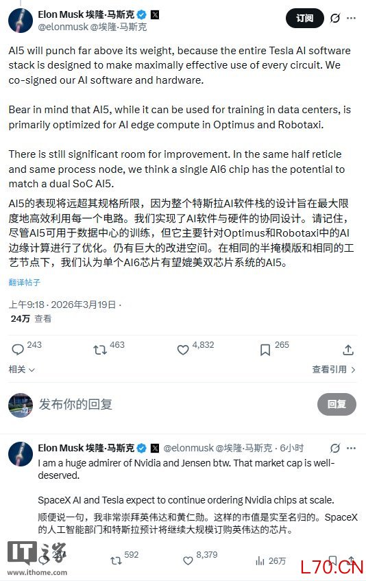 IT之家 3 月 19 日消息,埃隆 · 马斯克今日在 X 平台发文称,“如果运气好,再借助人工智能加速,我们或许能在 12 月完成 AI6 的流片。”