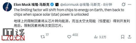 马斯克还称,“(人工智能在)地球上的限制因素将从芯片转向能源,而当太空太阳能(恒星能)得到开发利用后,限制因素将再次变回芯片。”