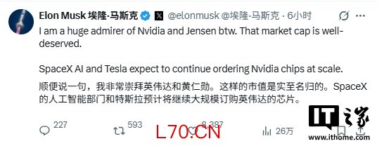在回复自己的这条贴文时,马斯克称:“顺便说一句,我非常崇拜英伟达和黄仁勋。这样的市值是实至名归的。SpaceX 的人工智能部门和特斯拉预计将继续大规模订购英伟达的芯片。”
