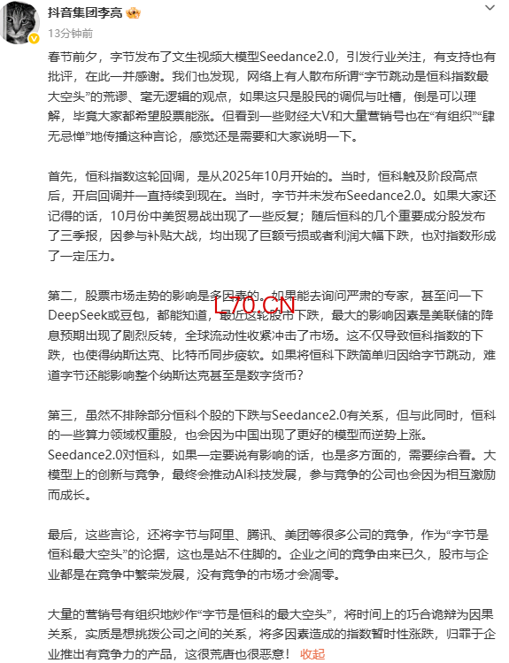 抖音集团李亮:炒作“字节是恒科的最大空头”很荒唐也很恶意