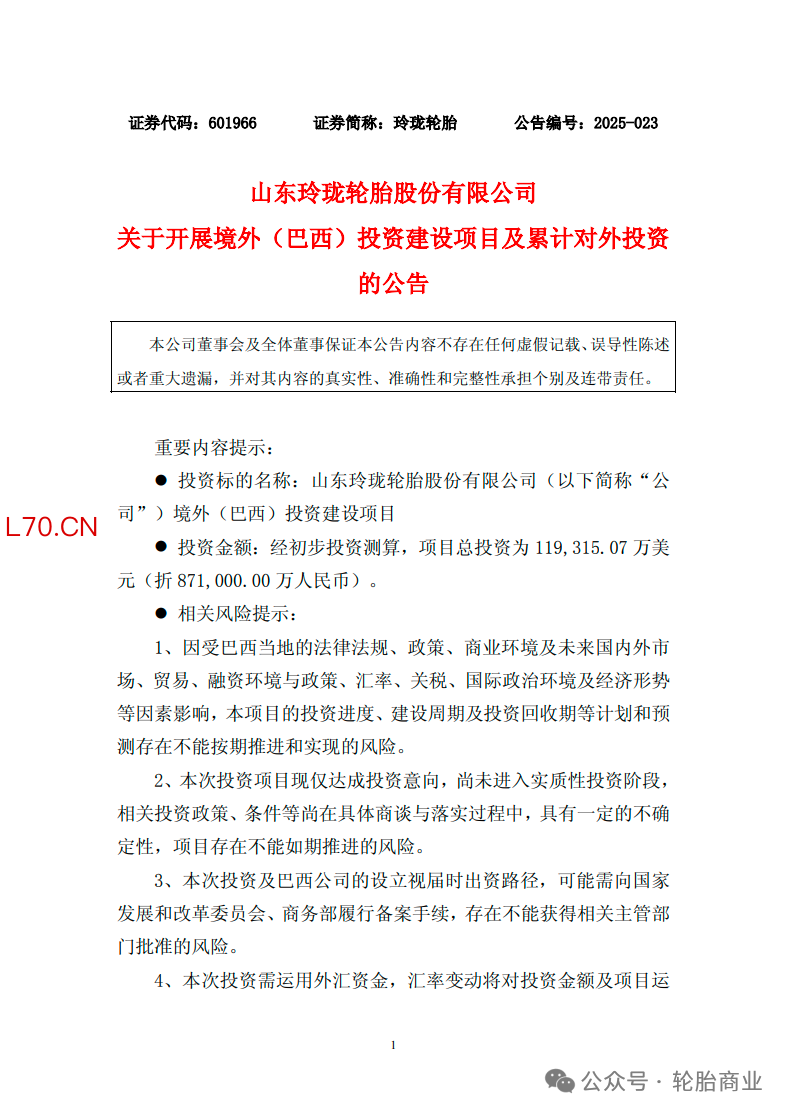 2025年4月25日,玲珑轮胎发布关于开展境外(巴西)投资建设项目及累计对外投资的公告。山东玲珑轮胎股份有限公司巴西)投资建设项目,项目总投资为119,315.07万美元(折 871,000.00 万人民币)。