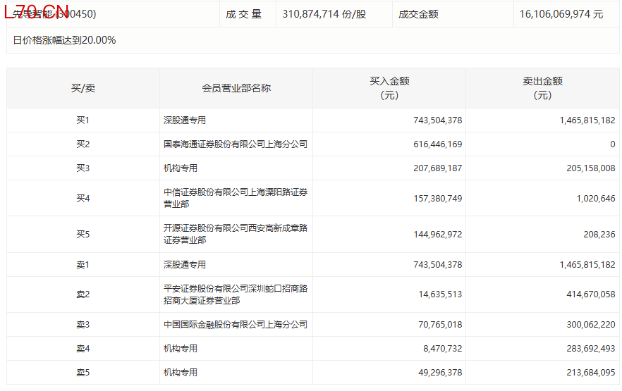 先导智能今日20cm涨停,有2家机构专用席位净卖出4.40亿元