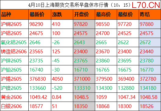 1#铜价报98450元/吨,涨730元;升水为200元/吨,涨20元;A00铝锭报24540元/吨,涨140元;贴水报60元;0#锌报23690元/吨,跌40元;1#锌报23590元/吨,跌40元;1#铅锭报16775元/吨,跌25元;1#镍报135400元/吨,跌50元;1#锡报376000元/吨,涨6000元;