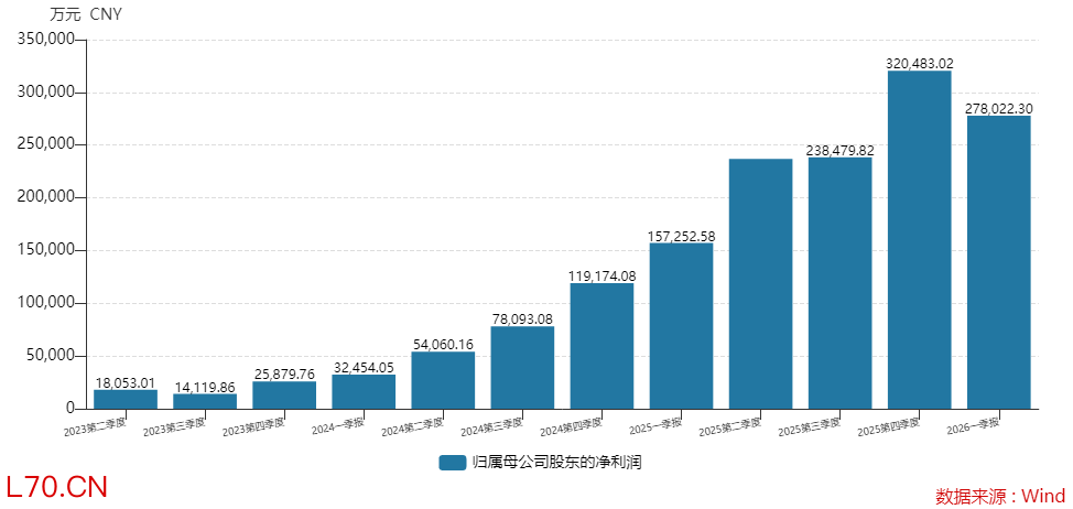 更受关注的是一季报。2026年一季度公司实现营业收入83.38亿元,同比增幅105.76%;归母净利润27.80亿元,同比增长76.80%。