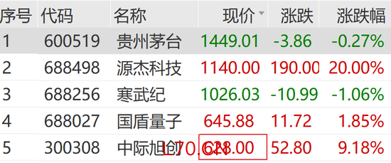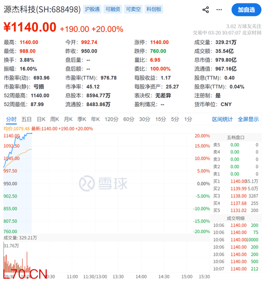 源杰科技走出20cm涨停,股价突破千元大关,成为A股历史上第8只千元股。截至发稿,源杰科技股价超越寒武纪,目前位居A股市场第二名。