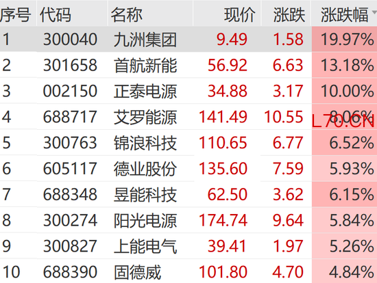 光伏逆变器概念股集体大涨,九洲集团20cm涨停,正泰电源(维权)涨停,艾罗能源、锦浪科技、德业股份、阳光电源等纷纷走强。
