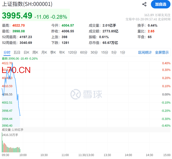 3月20日港股开户,A股主要指数开盘分化:上证指数微跌0.05%,深证成指涨0.86%,创业板指涨1.6%,科创综指涨0.54%。盘初市场冲高回落,截至发稿,上证指数飘绿,超4000只个股下跌。