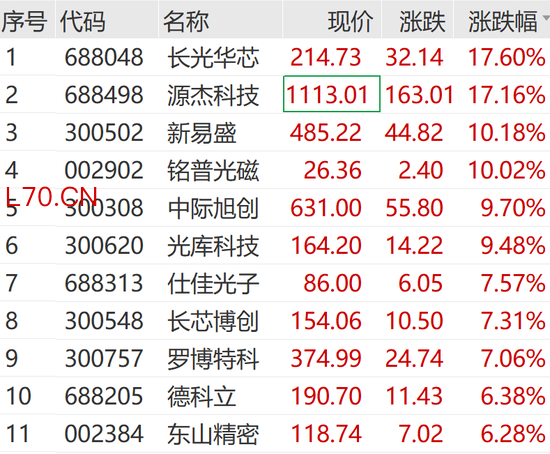 个股方面,铭普光磁2连板,长光华芯涨超17%,中际旭创、新易盛、德科立等纷纷大涨。