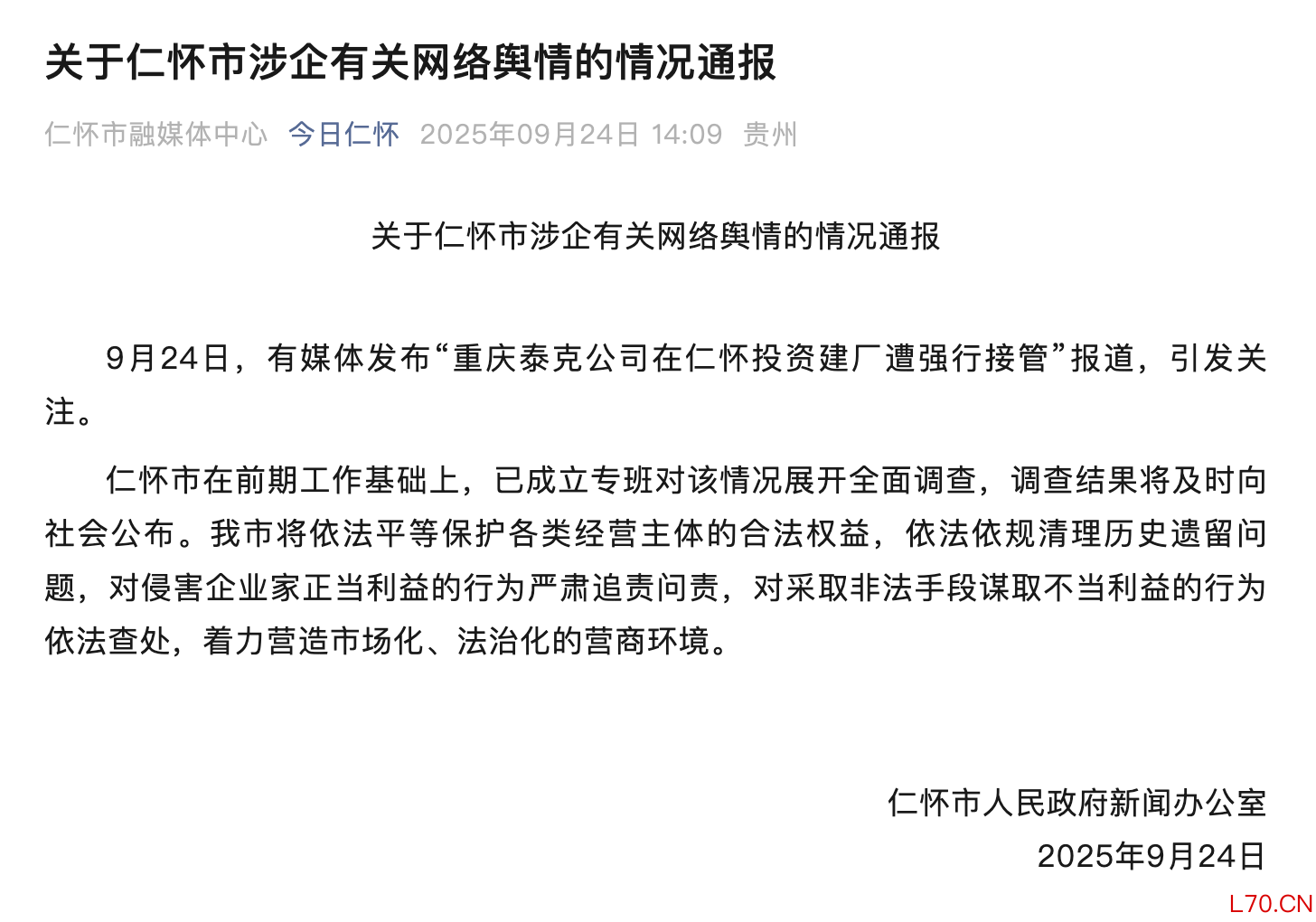 贵州仁怀就“重庆泰克公司在仁怀投资建厂遭强行接管”报道发布情况通报上海证券贵州仁怀就“重庆泰克公司在仁怀投资建厂遭强行接管”报道发布情况通报
